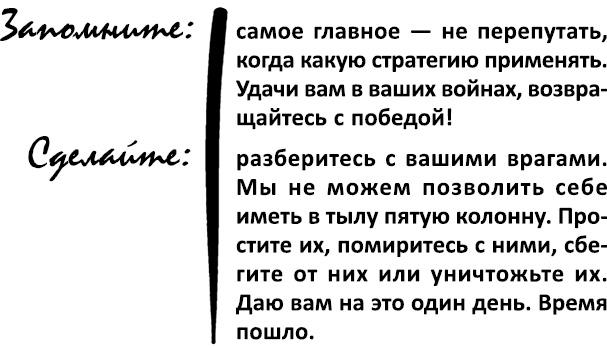 Однако есть враги, которых никак не получается превратить в друзей. Они вроде бы соглашаются с вами, улыбаются вам, а потом за спиной делают гадости. От таких врагов нужно бежать. Как бы близко к вам они ни находились. Даже если такой враг — вы сами. Тогда нужно найти способ отдалить от себя ту часть личности, которая вам вредит. Нужно сделать так, чтобы вы не были от нее зависимы. Бегите. Не оглядывайтесь. Просто бегите и все.