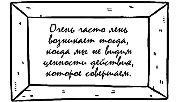 А чтобы осознать ценность, нужно взглянуть на действие со стороны, увидеть его в перспективе. Мне очень нравится история про трех строителей, у которых спросили, что они делают. Один сказал — «я таскаю камни», второй — «я строю стену», третий — «я возвожу храм». Если на вас внезапно напала лень, спросите себя — в чем смысл действия, которое я сейчас делаю? Может быть, для того чтобы справиться с ленью, вам будет достаточно вместо камней увидеть храм, который вы строите. А может быть и наоборот, увидев картину целиком, вы поймете, что вам не нравится не само действие — вам не нравится цель, к которой ведет действие. В этом случае нужно просто развернуться и найти другую цель и другое действие.
