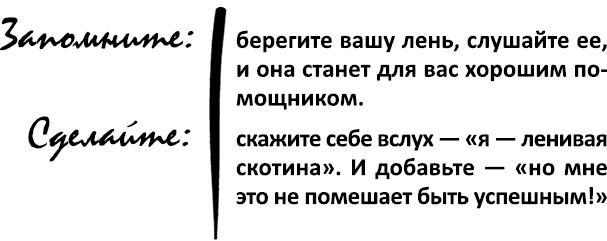 Может быть, вы не умеете делать то, что вам нужно сделать. Когда я начинал работать в газете, я каждый день садится за очередную заметку с ощущением, что не смогу ее написать. И, конечно, лень была тут как тут во всей красе — я был готов раскладывать пасьянс, читать газеты, трепаться с коллегами — делать что угодно, лишь бы не работать. Я не слышал, что лень говорит мне — дружище, ты просто не умеешь писать заметки. Научись это делать, и тогда я уйду. В конце концов я научился и стал легко писать по три-четыре заметки в день. Продолжая при этом раскладывать пасьянсы, читать газеты и трепаться с коллегами.
