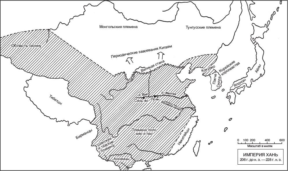 Ранние императоры Хань проявляли кипучую энергию, ведя успешную войну против кочевых племен сюнну. Они также оттеснили южноманьчжурские племена и продвинулись, обогнув Чжилийский залив, чтобы захватить Северную Корею. Хотя правители Хань не заняли Фуцзянь и Юньнань, они покорили дельту Кантона и северное побережье Вьетнама. Они проникли в Центральную Азию, торговали с Персией и в Прикаспии имели контакты с аванпостами Римской империи[17]. Хотя Хань воздерживались от тяжелого бремени общественных работ, способствовавших падению Цинь, все же они оставили после себя такой памятник, как первые 500 миль (800 км) Великого канала, по которому в их столицу в Лояне (Хэнань) доставлялся рис из хозяйств в долине Янцзы. Почти таким же триумфом строительного искусства была система дамб, контролирующая воды Желтой реки.
