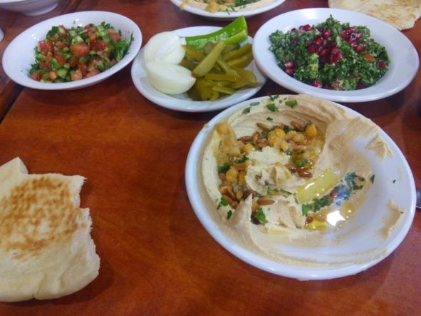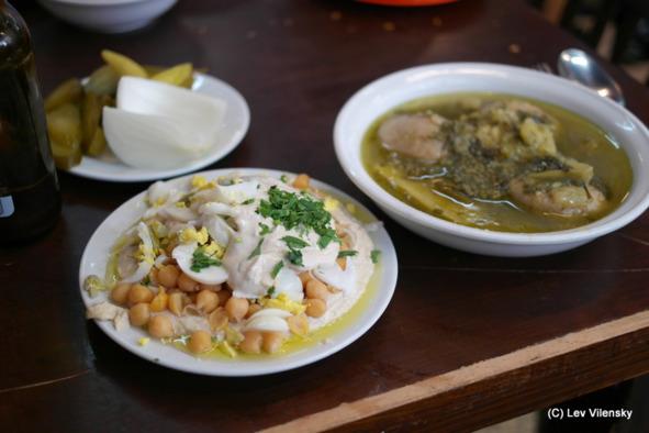 Впрочем, не только фалафелем славны иерусалимские закусочные, кухня которых вобрала в себя все лучшее, что есть у турок, курдов, арабов, марокканцев, румын и ашкеназских евреев. Хумус — основа основ арабско-турецкой кухни, питательная каша из мелко-мелко измельченного нута, сдобренная тахинным соусом и лимонным соком, с приправами, стандартными для любой закусочной, где хумус подается на тарелке — бобы «фуль», горячий нут, обжаренный мясной фарш, жареная куриная грудка, кедровые орешки и крутое яйцо, а сверху все это посыпано зелеными листьями кинзы. И — тоже традиционно — тарелочка с ломтиками сырого репчатого лука, кислых огурцов, и, иногда, маленького острого перчика. И зеленая острая перечная подлива. Только неумеха и турист ест хумус вилкой или ложкой, его надо «ленагев» — «вытирать», точнее, зачерпывать ломтиком поданной горячей питы, и съедать, откусывая намазанный кусок этой питы. Пока не станет чистой тарелка. Кто сказал, что нельзя вытирать хлебом тарелку, что это неприлично? Пожалуйте к нам — в иерусалимскую «народную» закусочную. В культовый «Пинати» на улице Мелех Джордж, в легендарный «Азура» на рынке Махане Иегуда, во вкусную «Хумусию» на улице Бен-Шетах — везде вы получите тарелку этого необычайно вкусного и питательного яства, пусть — для бедных, но очень богато греющего желудок как студенту, так и королю, как жене премьер-министра, так и старой арабской женщине, греющей усталые ноги свои на солнышке на открытой веранде хумусной закусочной в Старом Городе.