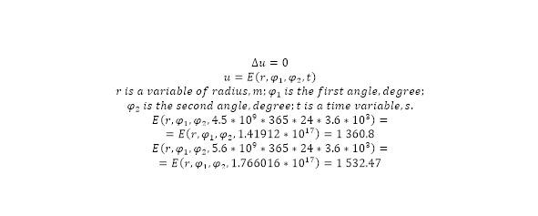 To determine the boundary conditions, it is sufficient to adopt a spherical coordinate system, despite the fact that the coordinate at zero angles at a radius of 1 astronomical unit is the position of the planet Earth on New Year’s Day — the transition from the night of December 31 to January 1. The Sun is also accepted as an absolutely smooth body, spreading uniform radiation over the entire surface, due to which an error for the presence of black spots is initially stipulated, which can be eliminated later. Thus, based on the above, it is necessary to state the fact that, based on the conditions taken, the Earth is located at 0 degrees in the latitude angle of the Sun, also taking into account the deviation of 23.497 degrees of the Earth’s axis, while the maximum deviation to the poles of the planet in the form of the specified angle can be calculated.