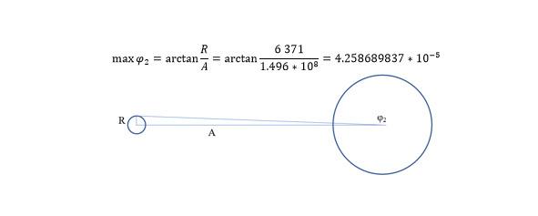 The conditions set lead to the fact that between the center of the Sun, the Earth and one of the poles of the Earth there are 3 imaginary straight lines forming at the time of the vernal equinox a right triangle with legs of 1 astronomical unit (1,496*108 km) and 1 radius of the Earth (for the polar case 6,356.8 km and for the equatorial 6,378.1 km), from where it is possible to calculate the angle according to the Pythagorean theorem (5).