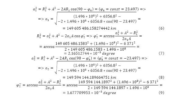 Also, from the same ratio, but in a transformed form, it is possible to obtain the angle of deviation at the time of June 21 and December 21 according to the cosine theorem (6—9).