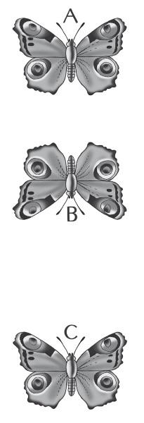Посмотрите на этих трех бабочек и скажите, какое расстояние больше: от точки А, головы первой бабочки, до точки В, головы второй бабочки, или от точки В до точки С, головы третьей бабочки?