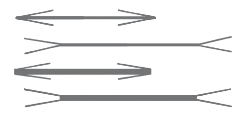 Попробуйте закончить две одинаковой длины прямые линии другими линиями, поставленными под различными углами к ней. Если закончить прямую линию тупыми углами, то кажется, что она удлиняется; от острых углов она как будто укорачивается.