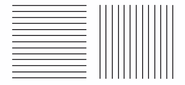 Если мы повернем квадрат так, что линии пойдут вертикально (правый рисунок), он нам покажется вытянутым в стороны, так как тогда недостанет двух горизонтальных линий, которые могли бы остановить наш глаз.
