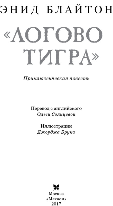 «Логово тигра» : приключенческая повесть / Энид Блайтон ; пер. с англ. О. М. Солнцевой ; худож. Джордж Брук. – М. : Махаон, Азбука-Аттикус, 2017.