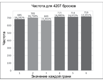 • Визуализации используются как учебный инструмент. Например, закон больших чисел наглядно демонстрируется динамической моделью бросков кубиков и построением гистограммы. С увеличением количества бросков процент выпадений каждой грани постепенно приближается к 16,667% (1/6), а размеры столбцов, представляющих эти проценты, постепенно выравниваются.