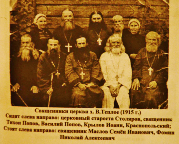 Ваше Высокопреосвященство! Имею честь доложить о следующем отрадном событии в приходе хутора Верхне-Теплого. До 1913 года в этом хуторе существовало трактирное заведение с распивочной и на вынос, благодаря чему пьянство, а с ним вместе картежная игра, сквернословие, воровство, драки усилились до ужасающих размеров. В казенной винной лавке, как я справлялся по документами в 1911 году было продано на пять хуторов водки на 38000 р., а в 1912 году на 39000. С первого же дня своего поступления в этот приход я твердо решился бороться с этим бичом народа. Сначала я начал произносить проведи с церковного амвона о пьянстве обличительного характера, для составления, которых пользовался творениями Святых Отец, в особенности творениями Святого Иоанна Златоуста, а также проповедями из журнала «Духовная Беседа»; в этих проповедях я полностью открыл гибель пьянства, а также и указал количество пропитых ими денег. Проповеди имели свое действие не на всех одинаково. Некоторые благоразумные были за то, чтобы закрыть трактирное заведение, как рассадник пьянства, а большинство стало высказывать неудовольствие, доходящее до подачи прошений. Не чувствуя за собою никаких проступков, я продолжал бороться с народным бедствием и к проповедям присоединил еще личные убеждения некоторых прихожан, а в особенности хуторского атамана урядника Николая Пономарева и выборных хуторского сбора, — и, слава Богу, труды мои увенчались успехом. Через два года моих увещаний 20 февраля 1913 года на хуторском сходе единодушно постановили: закрыть трактирное заведение на 1913, 1914, 1915 годы, о чем составлен приговор и возбуждено ходатайство пред господином Наказным Атаманом. Сообщая о таковом отрадном событии, покорнейше прошу благословения Вашего Высокопреосвященства хуторскому атаману Пономареву и выборным хуторского сбора. Теперь вполне можно быть убежденным, что пьянство сократится и найдется больше помощников мне в борьбе с пьянством. 1913 года марта 4 дня. №17.