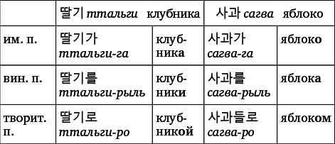 Что касается морфологии, то корейский, в отличие от русского, относится к агглютинативному типу, то есть к «приклеивающему». Это значит, что для изменения формы слова достаточно «приклеить» к его основе нужные частицы и падежные окончания. При этом зачастую данные частицы и окончания имеют всего лишь два варианта, выбор которых зависит от конечной буквы основы слова. Не то что в русском языке, где зачастую изменение по падежам происходит вместе с изменением основы, а для выбора нужного окончания нужно знать склонение интересующего нас слова. Сравните: