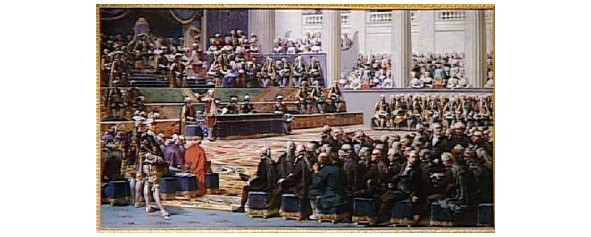 И вот 5 мая 1789 года в зале «Малых забав» в Версале состоялось торжественное открытие Генеральных Штатов. В соответствии с регламентом (от 1614 года!) депутаты были размещены посословно, справа от кресла Короля сидело духовенство, слева, дворянство, а напротив их, третье сословие. Вокруг же, была целая галерея со множеством зрителей обоего пола, все были одеты в свои лучшие парадные костюмы, при всех орденах и регалиях.