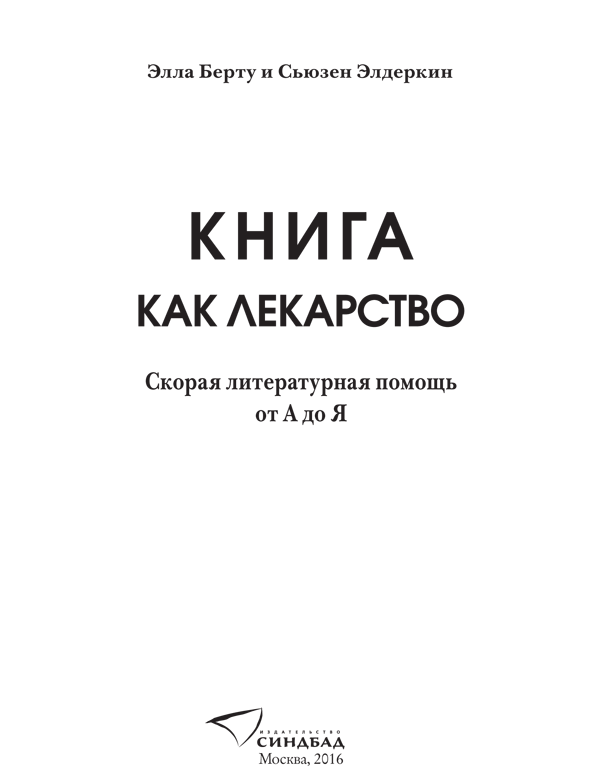 Книга как лекарство. Скорая литературная помощь от А до Я / Элла Берту, Сьюзен Элдеркин ; [пер. с англ. И. Новоселецкой]. — М. : Синдбад, 2016.