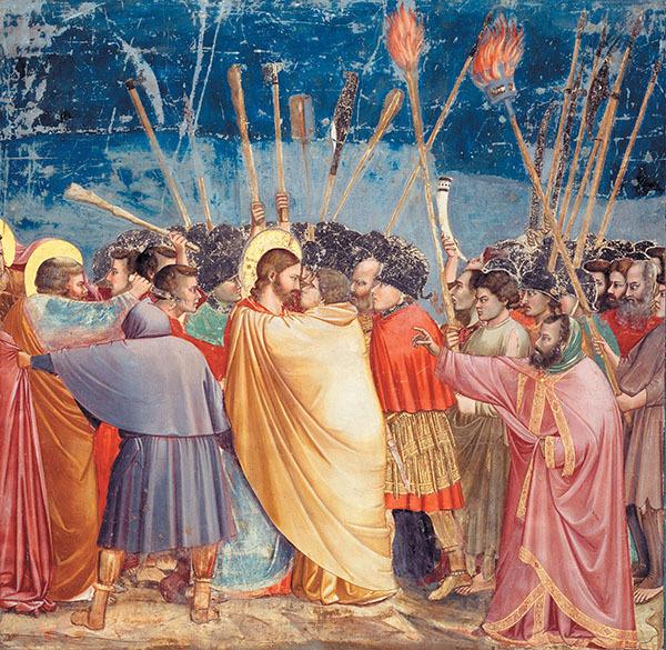 В христианском искусстве поцелуй Иуды – один из основных эпизодов Страстей Христовых. Иуда проник к Христу в Гефсиманский сад, куда Учитель отправился провести ночь в молитве. Поцелуй был условным жестом, по которому воины Синедриона должны были определить Христа, чтобы его арестовать. В лицах Иуды и Христа первый раз художник изображает то, что войдет в историю под названием «поединок взглядов».