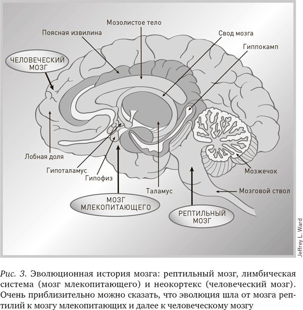Чтобы разобраться в структуре мозга, которая кажется случайной, в 1967 г. доктор Пол Маклин из Национального института психического здоровья попытался рассмотреть эволюцию мозга с позиции теории Чарльза Дарвина. Он разделил мозг на три части. (Дальнейшие исследования показали, что эта модель нуждается в уточнении, но мы используем ее как грубый набросок для приблизительного объяснения общей структуры мозга.) Во-первых, он заметил, что задняя и центральная часть человеческого мозга, включая мозговой ствол, мозжечок и подкорковые узлы, почти идентична по строению мозгу рептилий. Эти структуры, известные как «рептильный мозг», — самые древние структуры мозга, — управляют фундаментальными функциями организма, такими как равновесие, дыхание, пищеварение, сердцебиение и поддержание кровяного давления. Кроме того, они контролируют такие поведенческие схемы, как драка, охота, спаривание и территориальность, необходимые для выживания и воспроизведения себе подобных. Рептильный мозг существует примерно 500 млн лет (рис. 3).