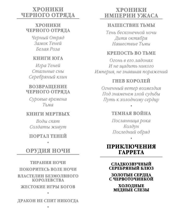 Сладкозвучный серебряный блюз ; Золотые сердца с червоточинкой ; Холодные медные слезы : романы / Глен Кук ; пер. с англ. К. Королева, Г. Косова, Е. Поляковой. — СПб. : Азбука, Азбука-Аттикус, 2021. — (Звезды новой фэнтези).