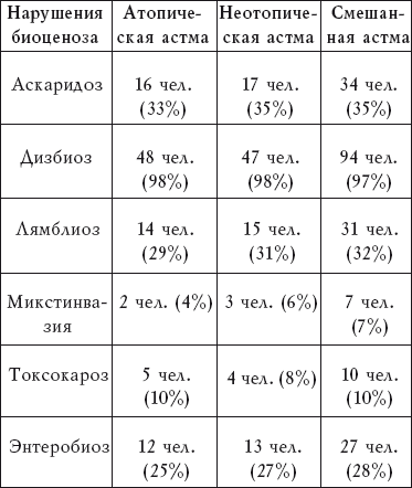 Процентное соотношение форм бронхиальной астмы и различных нарушений биоценоза