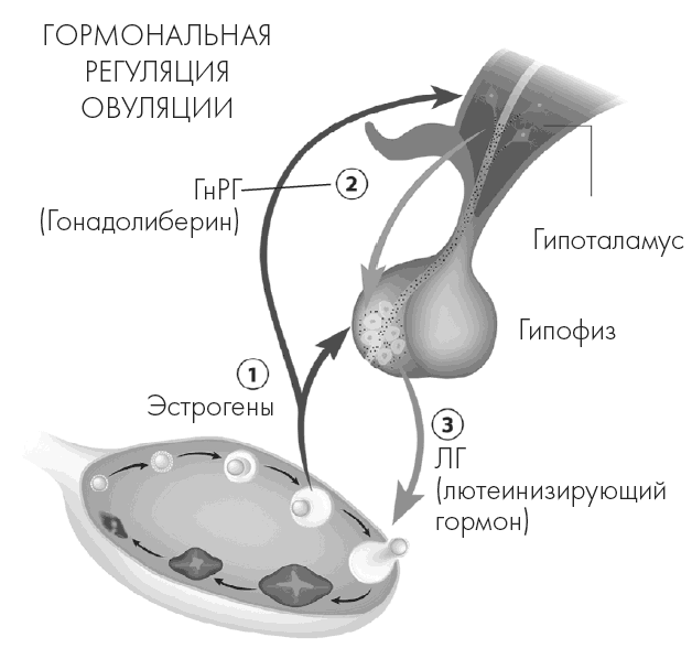 Все это время гипофиз постоянно держит связь с корой, гипоталамусом и яичниками. Как только гипофиз зафиксирует пик эстрогенов, он сообщает гипоталамусу и коре, что «клиент созрел», яйцеклетка подготовилась к выходу.