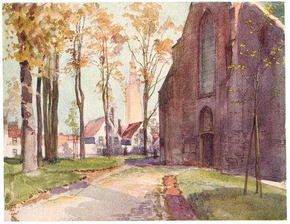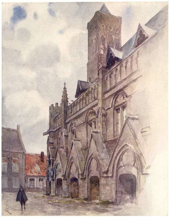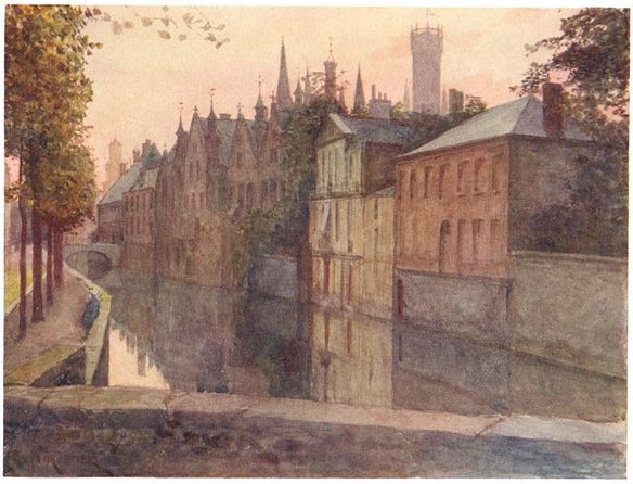 From the top of the Belfry one looks down on Page 7 what is practically a mediæval city. The Market-Place seems to lose its modern aspect when seen from above; and all round there is nothing visible but houses with high-pointed gables and red roofs, intersected by canals, and streets so narrow that they appear to be mere lanes. Above these rise, sometimes from trees and gardens, churches, convents, venerable buildings, the lofty spire of Notre Dame, the tower of St. Sauveur, the turrets of the Gruthuise, the Hospital of St. John, famous for its paintings by Memlinc, the Church of Ste. Elizabeth in the grove of the Béguinage, the pinnacles of the Palais du Franc, the steep roof of the Hôtel de Ville, the dome of the Couvent des Dames Anglaises, and beyond that to the east the slender tower which rises above the Guildhouse of the Archers of St. Sebastian. The walls which guarded Bruges in troublous times have disappeared, though five of the old gateways remain; but the town is still contained within the limits which it had reached at the close of the thirteenth century.