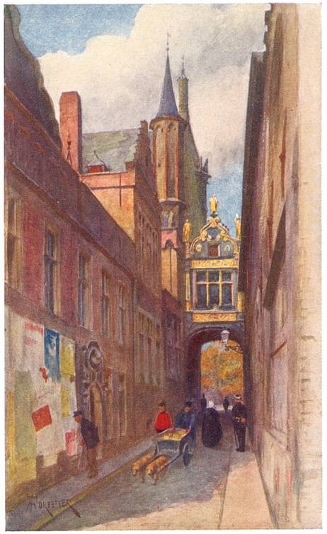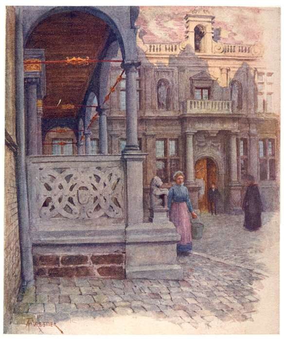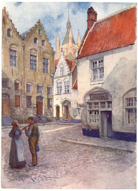 At first sight this Market-Place, so famed in song, is a disappointment. The north side is occupied by a row of seventeenth-century houses turned into shops and third-rate cafés. On the east is a modern post-office, dirty and badly ventilated, and some half-finished Government buildings. On the west are two houses which were once of some note—the Cranenburg, from the windows of which, in olden times, the Counts of Flanders, with the lords and ladies of their Court, used to watch the tournaments and pageants for which Bruges was celebrated, and in which Maximilian was imprisoned by the burghers in 1488; and the Hôtel de Bouchoute, a narrow, square building of dark red brick, with a gilded lion over the doorway. But the Cranenburg, once the 'most magnificent private residence in the Market-Place,' many years ago lost every trace of Page 5 its original splendour, and is now an unattractive hostelry, the headquarters of a smoking club; while the Hôtel de Bouchoute, turned into a clothier's shop, has little to distinguish it from its commonplace neighbours. Nevertheless,