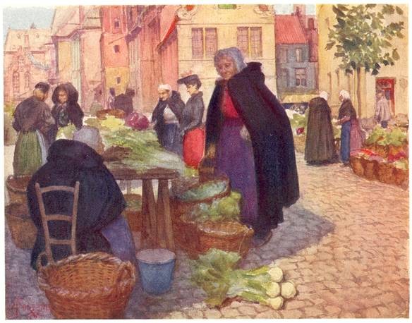 Every visitor to 'the quaint old Flemish city' goes first to the Market-Place. On Saturday mornings the wide space beneath the mighty Belfry is full of stalls, with white canvas awnings, and heaped up with a curious assortment of goods. Clothing of every description, sabots and leathern shoes and boots, huge earthenware jars, pots and pans, kettles, cups and saucers, baskets, tawdry-coloured prints—chiefly of a religious character—lamps and candlesticks, the cheaper kinds of Flemish pottery, knives and forks, carpenters' tools, and such small articles as reels of thread, hatpins, tape, and even bottles of coarse scent, are piled on the stalls or spread out on the rough stones wherever there is a vacant space. Round the stalls, in the narrow Page 4 spaces between them, the people move about, talking, laughing, and bargaining. Their native Flemish is the tongue they use amongst themselves; but many of them speak what passes for French at Bruges, or even a few words of broken English, if some unwary stranger from across the Channel is rash enough to venture on doing business with these sharp-witted, plausible folk.