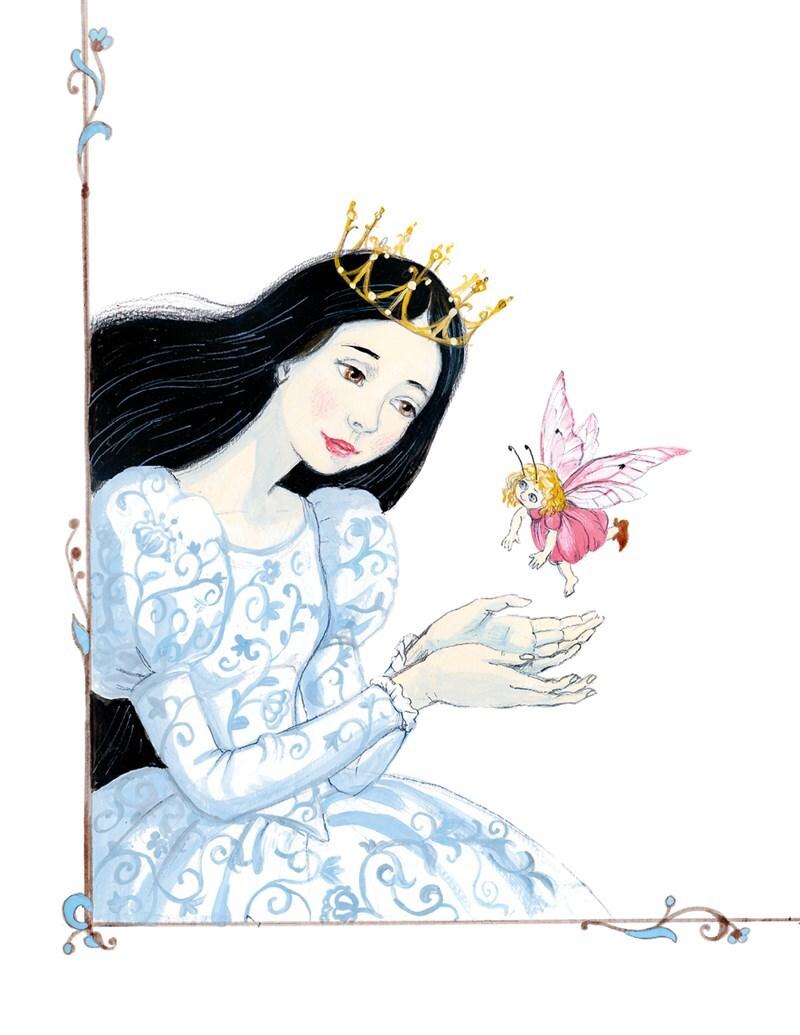 – Посмотри, моя радость, какой редкий гость залетел сегодня в наш сад! – воскликнул принц Теодор. – Нет, нет, ты смотришь на ласточку. Посмотри на куст белых роз возле фонтана. Видишь теперь? На розу опустилась девочка-эльф в ярко-алом платьице!