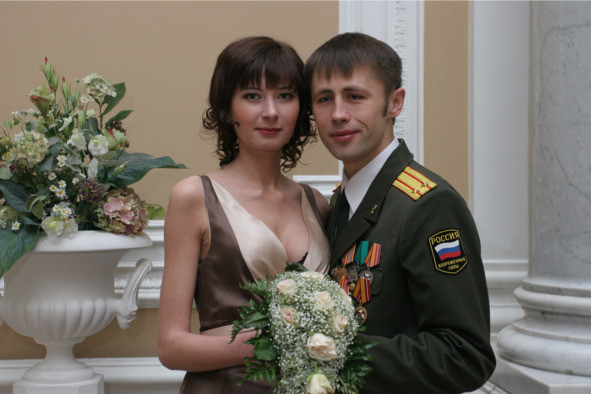 Мы со Славой расписывались во Дворце бракосочетаний на Английской набережной — одно из тех мест, интерьер которого внушает восхищение: роскошная парадная лестница, старинная мебель, зеркала, камин, огромные дубовые двери. До начала церемонии наши гости находились в одной гостиной, а мы — жених и невеста, свидетели — в другой. В течение часа нас фотографировал профессиональный фотограф. Я думала, зачем нам его услуги, ведь у нас есть фотоаппарат? Но он нас просто очаровал фотосессией: «Жених нежно обнимает невесту, у невесты скромная улыбка на губах. Теперь пройдемте к этой нише. Больше счастья в глазах! Головки склоните друг к другу». В итоге получились очень интересные фото. Несколько слов о наших замечательных свидетелях. Денис служил вместе со Славой в госпитале в Ханкале, а мы с Ирой знаем друг друга еще со школы. Они не просто формально поставили свои подписи в нужной графе, а украсили наш праздник своим добрым отношением и веселым настроением. В зал для бракосочетаний входили под традиционный марш Мендельсона, а завершали церемонию «Шербургские зонтики». Затем как фейерверк поздравления, фотовспышки, шампанское!