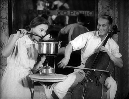 Напомним, что сюжет в фильме Козинцева и Трауберга отталкивается от нежелания Елены Александровны Кузьминой [35], выпускницы одного из центральных педагогических техникумов, ехать по распределению в глухую алтайскую деревню. Перспектива скорого замужества и налаживания комфортной семейной жизни вступает в противоречие с моральной и гражданской позицией, причем поначалу гражданская позиция терпит вполне очевидное поражение. Мещанская сосредоточенность на маленьком личном счастье является тем препятствием, которое героине надлежит преодолеть на пути к полноценному советскому перевоплощению. Проекции семейной идиллии выдержаны в подспудно фарсовой стилистике: как и в «Путевке в жизнь», авторы изобразили ее в утрированно приторном духе. Символом мещанского уюта, взыскуемого героиней, выступает гипертрофированное изобилие выставленной в витрине шикарного магазина фарфоровой посуды, которая не хуже, чем в гофмановских сказках, обладает собственным голосом: в одной из сцен посуда исполняет пародийно-оперную полифоническую партию (написанную молодым Шостаковичем), варьируя на разные голоса одно и то же слово: «Останься!» Другая многократно повторяемая фраза — «Какая хорошая будет жизнь!» — в такой же оперной обработке служит фоном для нескольких сцен, пародирующих интеллигентские/мещанские представления о семейном счастье: на фоне большого зеркала с надписью «Очень хорошо» муж, весь в белом, радостно наяривает на виолончели, а жена, тоже вся в белом, приплясывает возле примуса, в такт размахивая половником и крышкой от кастрюли; та же пара, вся в белом, стоит в дверном проеме какого-то сплошь увитого белыми цветочными гирляндами транспортного средства. Транспортное средство несется на фоне проплывающих мимо облаков и высотных зданий, а за плечом у мужа одетый в ливрею и пудреный парик музыкант играет на трубе. Чуть позже, уже на Алтае, вся эта фантасмагория будет жесточайшим образом спародирована через увиденное со стороны домашнее пространство перерожденца-председателя, с двумя фарфоровыми чайниками на столе, храпящим мужем и забитой женой — на фоне все той же оперной партии.