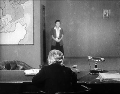 «Звонок другу» не приносит желаемого результата, и Кузьмина возвращается к конторке, но даже и не пытается ничего писать, а попросту впадает в истерику. Появляется второй проводник и без лишних формальностей отводит ее к двери, за которой принимаются решения об учительских судьбах, — и впускает ее внутрь. Там героиня сталкивается с третьим служебным персонажем; это женщина, она подчеркнуто снята со спины — т. е. лишена лица — но, как было сказано выше, очень напоминает Н. К. Крупскую. Судя по всему, здесь мы имеем дело с аллегорической фигурой, призванной воплощать власть как таковую. Войдя в кабинет, Кузьмина оказывается в треугольнике, вершинами которого являются Власть, портрет Ленина и фрагмент карты СССР с изображением Восточной Сибири и Приморья. Сигнал вполне очевиден, но героиня, поддавшись внезапному порыву, в очередной раз делает неверный выбор. Попытка снять с себя индивидуальную ответственность за судьбы родины («Разве я одна?») переходит в очередную презентацию семейного проекта — зажмурив глаза, на фоне все той же «мещанской» темы, на сей раз уже в совершенно шарманочной аранжировке. Колхоз, как известно, есть дело добровольное, а потому Власть не только с готовностью идет навстречу учительнице Кузьминой и желает ей счастливого жизнестроительства, но и — напоказ — выговаривает «отдельным техникумам», которые «вопреки приказу Наркомата направляют учителей на места в порядке разверстки».