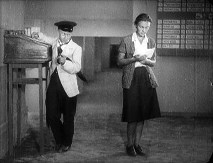 Впрочем, голос советской публичности не оставляет героиню. Затухающий кадр с ее неловкой фигурой сменяется коротким словом «ТЫ», которое впоследствии оказывается частью плаката, висящего в приемной Наробраза, — причем плаката, ситуативно более чем уместного, поскольку целиком его легенда звучит как: «Ты — участник культпохода?» Весь эпизод с приключениями Кузьминой в Наробразе построен как инверсия архетипической для социально-критической традиции XIX–XX веков ситуации, где индивид сталкивается с государственным дисциплинарным пространством, представленным в образе того или иного учреждения. Только теперь вместо истории о маленьком человеке, которого бездушная машина заставляет блуждать по бесконечным коридорам и инстанциям, чтобы в конце концов выплюнуть наружу — униженного, измочаленного и не добившегося ровным счетом ничего, — мы видим сюжет о руководящей и направляющей роли советской власти в жизни рядового гражданина.