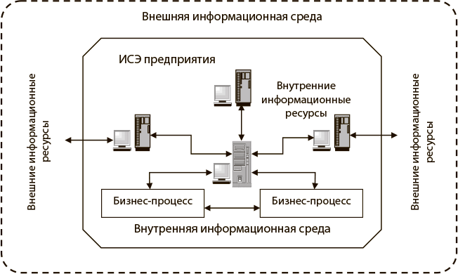 Управление информационными ресурсами, которое включает сбор данных, их формализацию, накопление, хранение, обработку и другие операции, в настоящее время выделяется в отдельную экономическую функцию, реализуемую за счет организации информационной системы, охватывающей как внешнюю, так и внутреннюю среду предприятия и оказывающей влияние, на протекание бизнес-процессов в фирме (рис. 1).