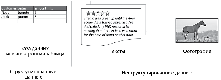 На рис. 1.3 показаны примеры структурированных и неструктурированных данных. Модели извлечения знаний берут источник неструктурированных данных и извлекают из него структуру, используя МО.