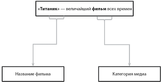 Для сферы медицины можно создать модель извлечения знаний, которая будет принимать в качестве входных данных медицинские документы и извлекать диагноз, историю и проявления болезни. В примере, показанном на рис. 1.4, модель принимает в качестве входных данных предложение и извлекает из него название и тип медиа. Применяя такую модель к комментариям на форуме поклонников кино, мы могли бы генерировать сводные отчеты о том, какие фильмы обсуждаются наиболее часто.