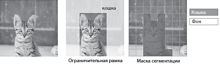 Задача извлечения знаний может применяться для поиска на изображении интересующих областей и последующей их классификации по категориям. Два распространенных подхода показаны на рис. 1.5: более грубый метод обнаружения объектов подразумевает выделение интересующей области прямоугольником (или ограничительной рамкой), а метод сегментации производит точное отнесение пикселей изображения к рассматриваемой категории.