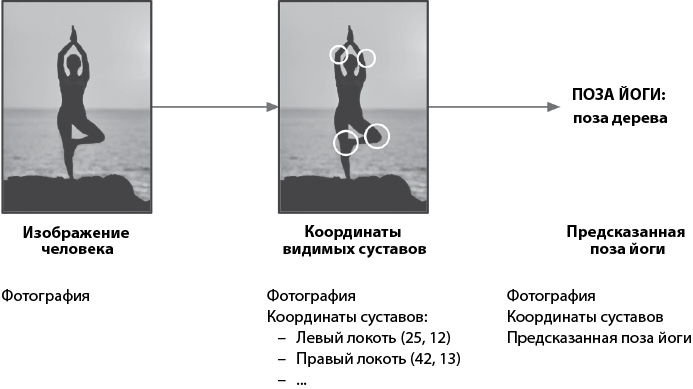 Иногда извлеченная информация может использоваться в качестве входных данных для другой модели. Так, мы могли бы извлекать ключевые точки из видеозаписи, демонстрирующей принятую йогом позу, с помощью модели для распознавания поз и «скармливать» эти ключевые точки второй модели, классифицирующей позу как правильную или неправильную на основе размеченных данных. Как может выглядеть такая цепочка из двух моделей, показано на рис. 1.6. При этом первая модель извлекает структурированную информацию (координаты суставов) из неструктурированных данных (фотографии), а вторая принимает эти координаты и классифицирует их как позу йоги.