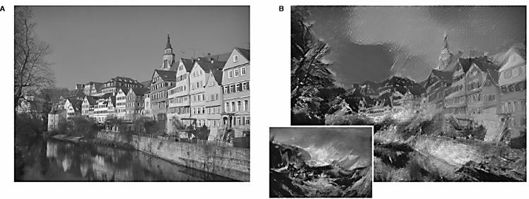 Рис. 1.8. Пример переноса стиля из статьи Гатиса (Gatys) и др. «Нейронный алгоритм для художественных стилей»