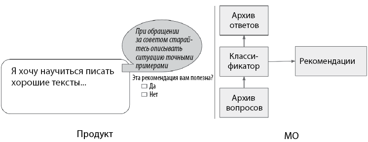 Для каждого проекта есть несколько способов реализации с помощью МО. Слева на рисунке (рис.. I.1) представлен макет помощника по написанию текстов. Помощник дает рекомендации и получает от пользователя обратную связь. Справа на рисунке — схема метода МО для выдачи этих рекомендаций.