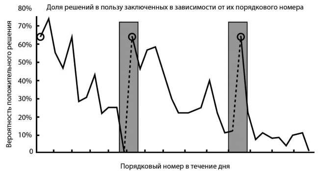 Психологи сделали выборку из 1112 решений об условно-досрочном освобождении заключенных, вынесенных опытными судьями со средним стажем 22,5 года. Выяснилось, что доля положительных решений постепенно снижалась с ≈65 % до почти нулевого внутри каждой сессии и резко возвращалась к прежнему уровню после перерыва (рис. 1).