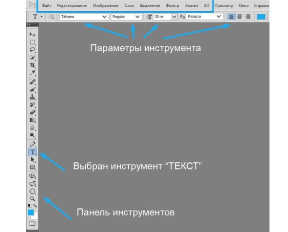 Если на панели инструментов выбирается нужный инструмент, например, «Текст», то в верхней части будут видны параметры инструмента. Эти параметры можно изменять на своё усмотрение. Для текста выбираем тип шрифта, толщину, размер и цвет.