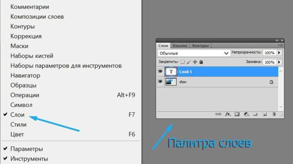 В правой части рабочего окна программы в виде значков находятся так называемые палитры, которые включаются из основного пункта меню «Окно», если стоит галочка напротив названия палитры.