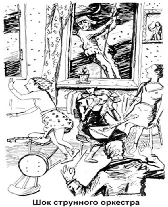 Вот некоторые из них. Пару недель спустя, поздним вечером, в кромешном мраке, спустившись с крыши на веревке, он заглянул в окно третьего этажа, раздувая в зубах тлеющую скорлупу грецкого ореха, в классе этом шла репетиция струнного оркестра, впечатлительные девочки с визгом ринулись к выходу, затоптав при этом три балалайки и домбру.