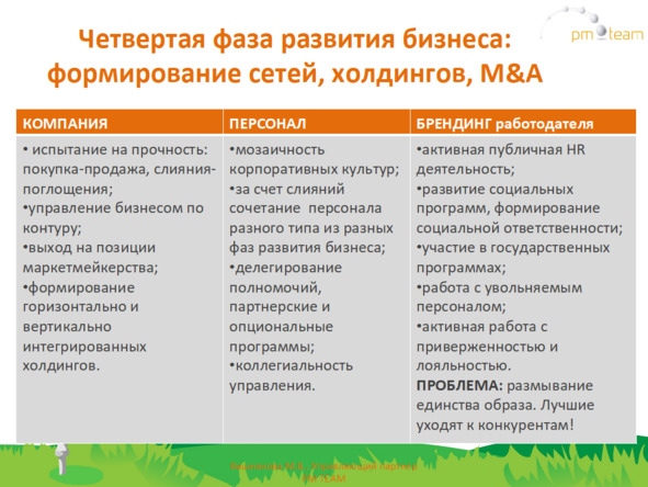 На четвертой фазе есть много общих черт с реалиями второй фазы. На второй фазе компания достраивала полноту функционалов, делала четкую системную структуру, а на четвертой — старается объединить под своим зонтичным брендом все недостающие прежде для полномасштабной производственной цепочки активности, одновременно избавляясь от того, что является «лишним» с точки зрения собственника.