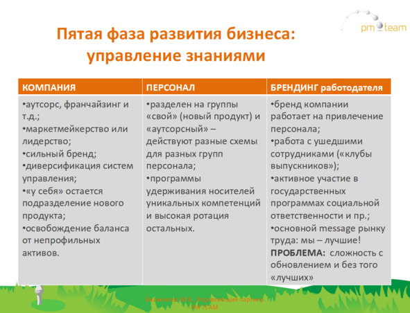Пятая фаза — это управление знаниями, наиболее активная эксплуатация стартовой бизнес идеи, созревшей до весомого плода, прошедшей все сложные пути роста и развития, рыночные риски и пр. Это бизнес идея, завоевавшая мир..