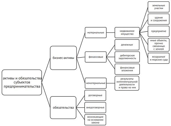 Осуществление предпринимательской деятельности, с одной стороны, предполагает формирование и использование разнообразных бизнес-активов, которые могут быть подразделены на материальные (движимое и недвижимое имущество), финансовые (денежные активы в национальной и иностранной валюте, дебиторская задолженность, финансовые вложения) и нематериальные (результаты интеллектуальной деятельности и иные объекты интеллектуальной собственности (исключительные права на них)) активы. С другой стороны, она порождает определенные обязательства, которые могут возникать вследствие договора или односторонних действий, на основании закона (обязанности по уплате обязательных платежей в бюджет и государственные внебюджетные фонды) либо вследствие причинения вреда.
