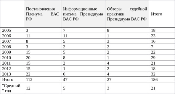 Ежегодно в ВАС принималось около двух десятков документов содержащих абстрактные разъяснения. Наиболее популярным жанром были постановления Пленума. В среднем за год принималось 12 разных документов. Наименее популярными были обзоры судебной практики (в среднем 3 единицы за один год). Более подробное распределение по годам указано в таблице 1.