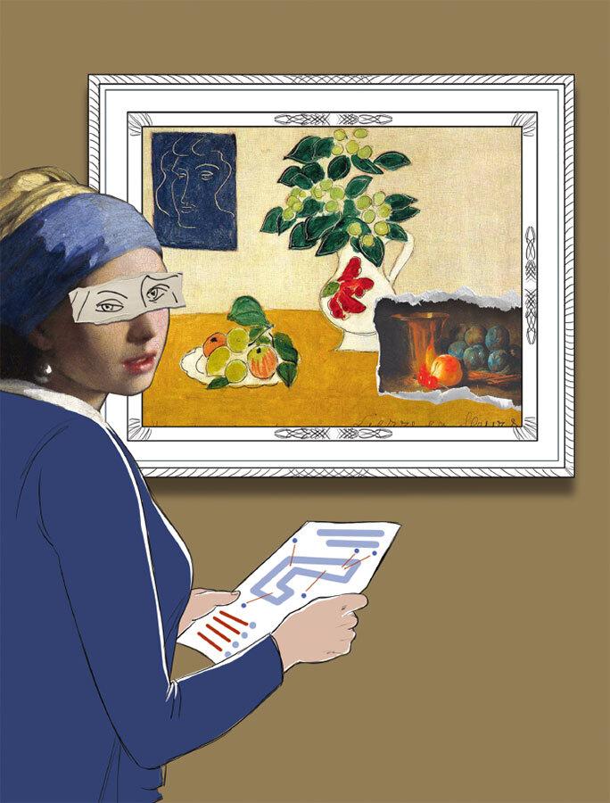 Анри Матисс. Натюрморт с вазой, фруктами и чашкой, 1941. Частная коллекция; Жан-Батист-Симеон Шарден. Натюрморт с графином серебряным кубком и фруктами, дата создания неизвестна. Бостонский музей изящных искусств; Ян Вермеер. Девушка с жемчужной сережкой, ок. 1665. Королевская галерея Маурицхёйс, Гаага