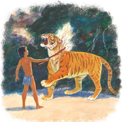 Как и предполагал глава волчьего семейства, Шер-Хан угодил в костёр дровосеков, остановившихся на ночлег, и сильно обжёг лапы. Это привело его в ярость. Волки, однако, не очень-то испугались, поскольку знали, что зверь не сможет протиснуться сквозь узкое отверстие в пещеру – разве что мордой и передними лапами. Шер-Хану не удастся дотянуться до ребёнка в любом случае – скорее застрянет.
