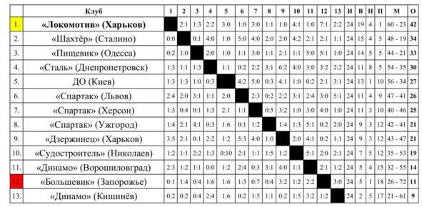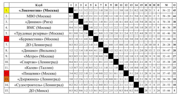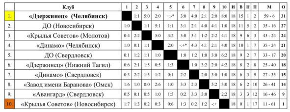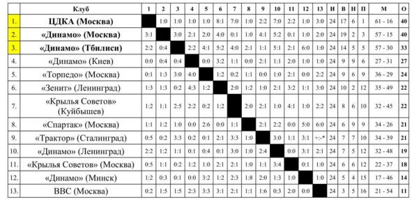 Чемпион — ЦДКА Москва: В. Никаноров (в, 24 матчей), В. Чистохвалов (16), А. Водягин (19, 3), И. Кочетков (18), А. Прохоров (22), А. Портнов (2), В. Соловьёв (16, 3), А. Башашкин (3), А. Виноградов (12), Б. Афанасьев (5), Е. Бабич (3), В. Меньшиков (1), А. Гринин (22, 7), Г. Федотов (12, 7), В. Бобров (19, 14), В. Дёмин (24, 9), С. Шапошников (3), В. Николаев (24, 14), П. Щербатенко (2), М. Дидевич (3, 4), Н. Шкатулов (1), К. Лясковский (13). Старший тренер — Б.А.Аркадьев.