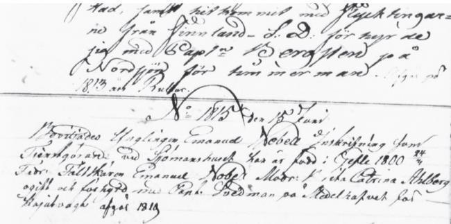 Сим подтверждается найм подростка Иммануила Нобеля, несущего службу при Доме моряков <…> он рожден в Евле в год 1800‑й, 24 марта <…>] Отец: фельдшер Иммануил Нобель, мать: Брита Катарина Альберг. Неженат. Нанят капитаном Сведманом каютным юнгой, для плавания в Средиземном море <…>1