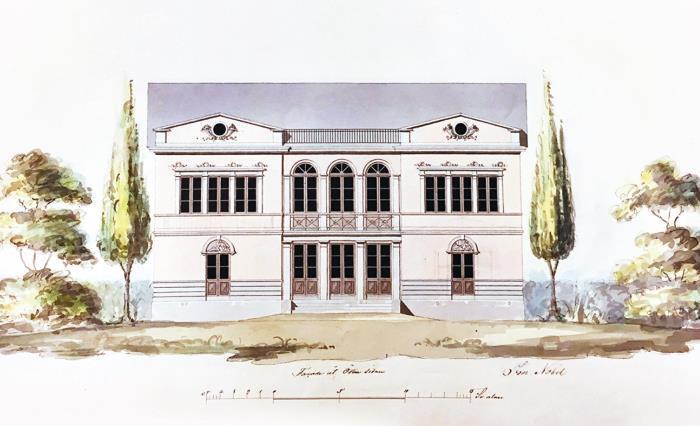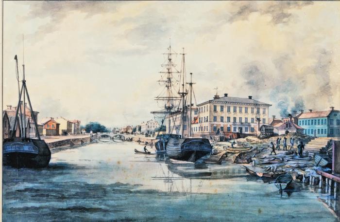 Корабельная верфь и школа в Евле. Последняя спроектирована Фредриком Блумом в 1813 году. Акварель Фердинанда Толлина. 1840-е годы